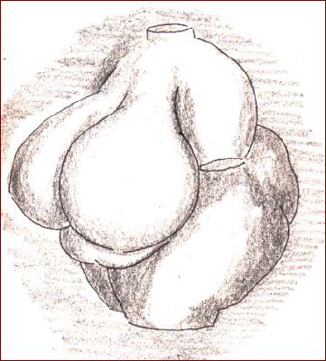 Tags darauf, bald nach dem Morgenläuten, machte ich mich erneut auf den Weg zum alten Steinbruch, ich nahm einen großen mit Heu gefüllten alten Sack mit und wollte meine Skulpturen bergen. Doch so sehr ich sie auch suchte, so sehr ich mit die Hände in den dichten dornigen Gesträuchen des Steinbruchs zerkratzte und zerschnitt - ich fand nichts. Keine Spur. Auch die Höhle war leer. Traurig ging ich nach Hause. Traurig betrachtete ich meine Skizzen. Wo waren sie hingekommen, die runden Frauen? Welche Bewandtnis hatte es mit ihnen...”